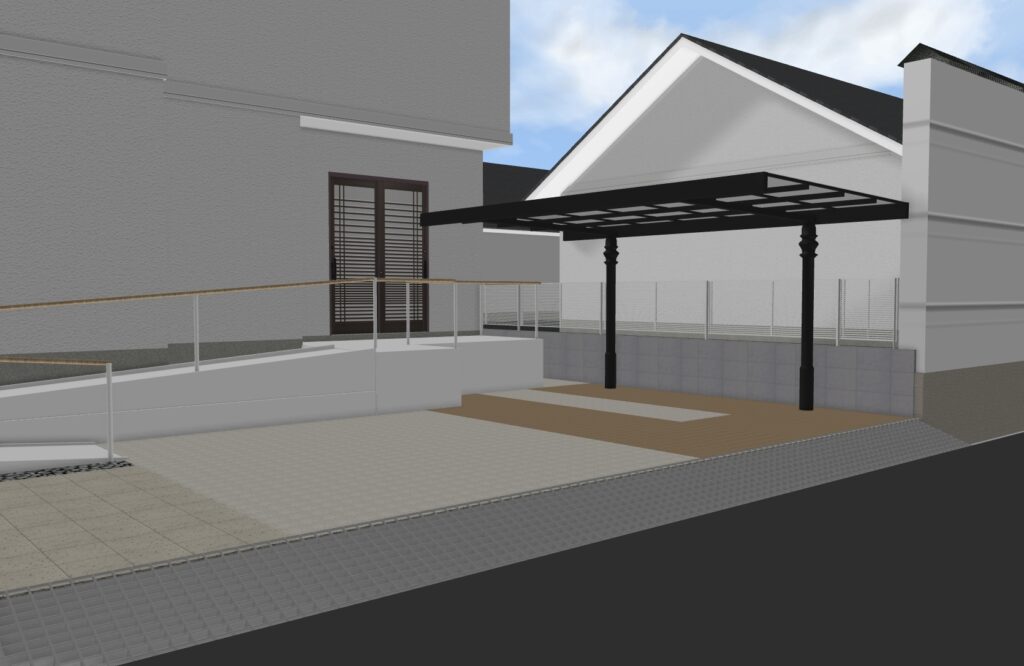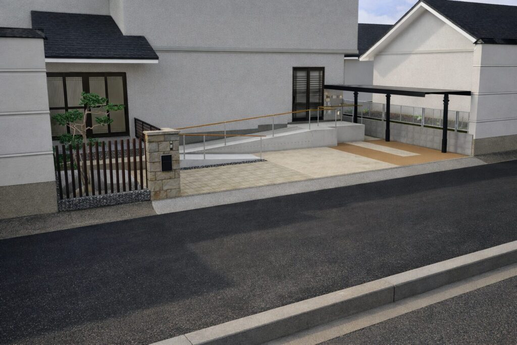 カーポートと全面床タイル貼りの駐車場が映える外構です。
